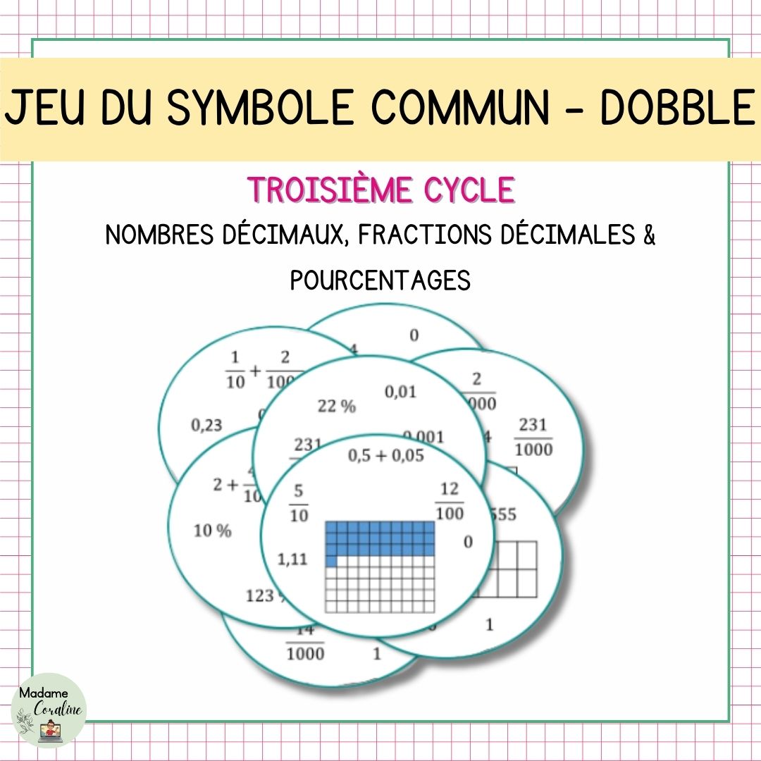 Qui trouvera le symbole commun en premier ? Ce jeu de type Dobble permet de réviser les fractions, les nombres décimaux et les pourcentages de façon dynamique et autonome. Parfait pour le 3e cycle !