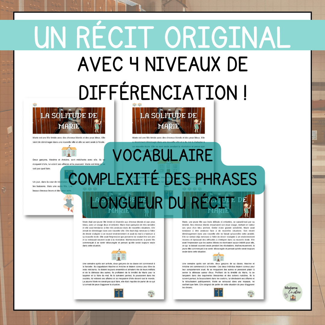 Marie vient d'arriver dans sa nouvelle école. Un peu anxieuse, elle ne s'attend pas à ce que les débuts soient si difficiles… Un récit original illustré et différencié qui permet également d'aborder avec les élèves le sujet de l'intimidation.