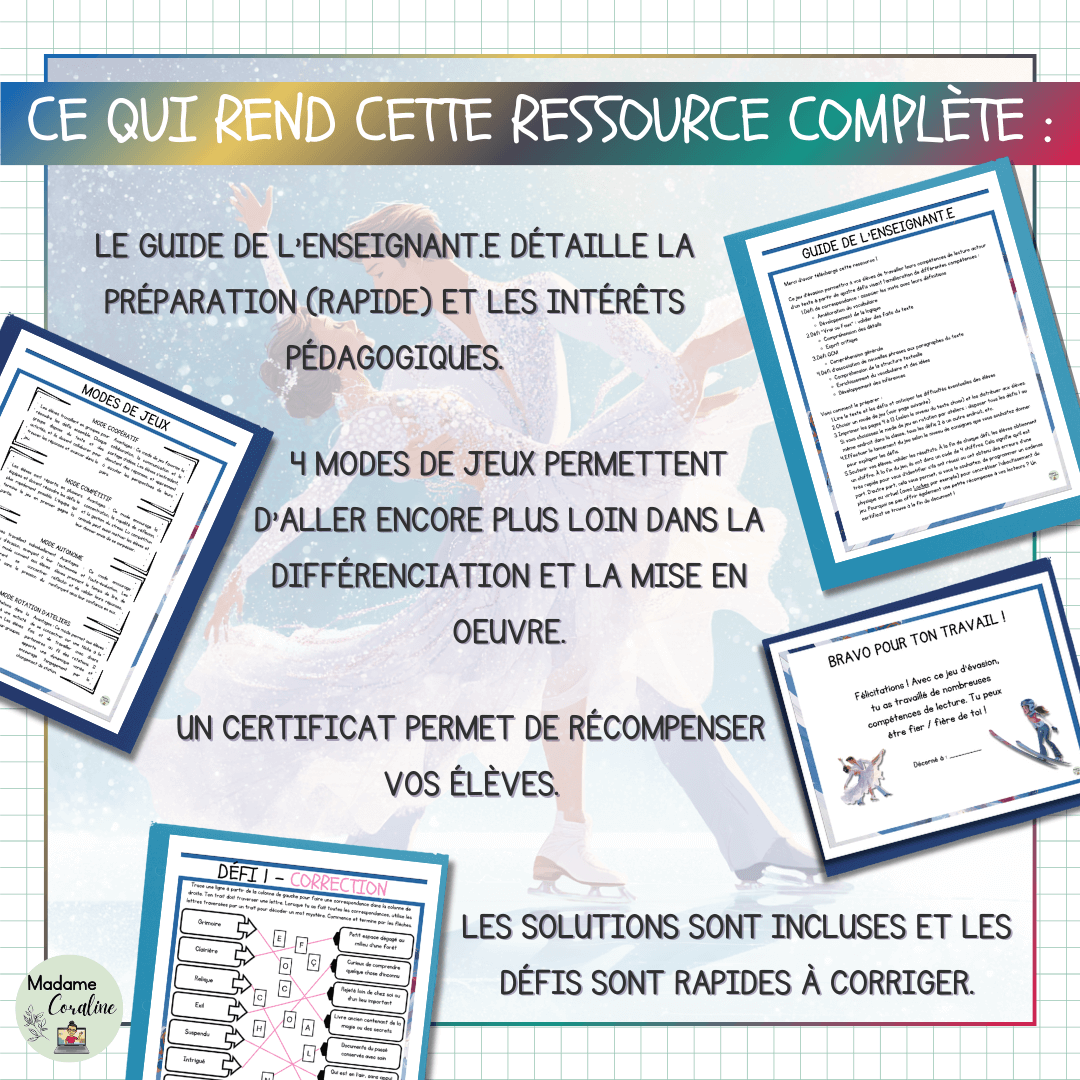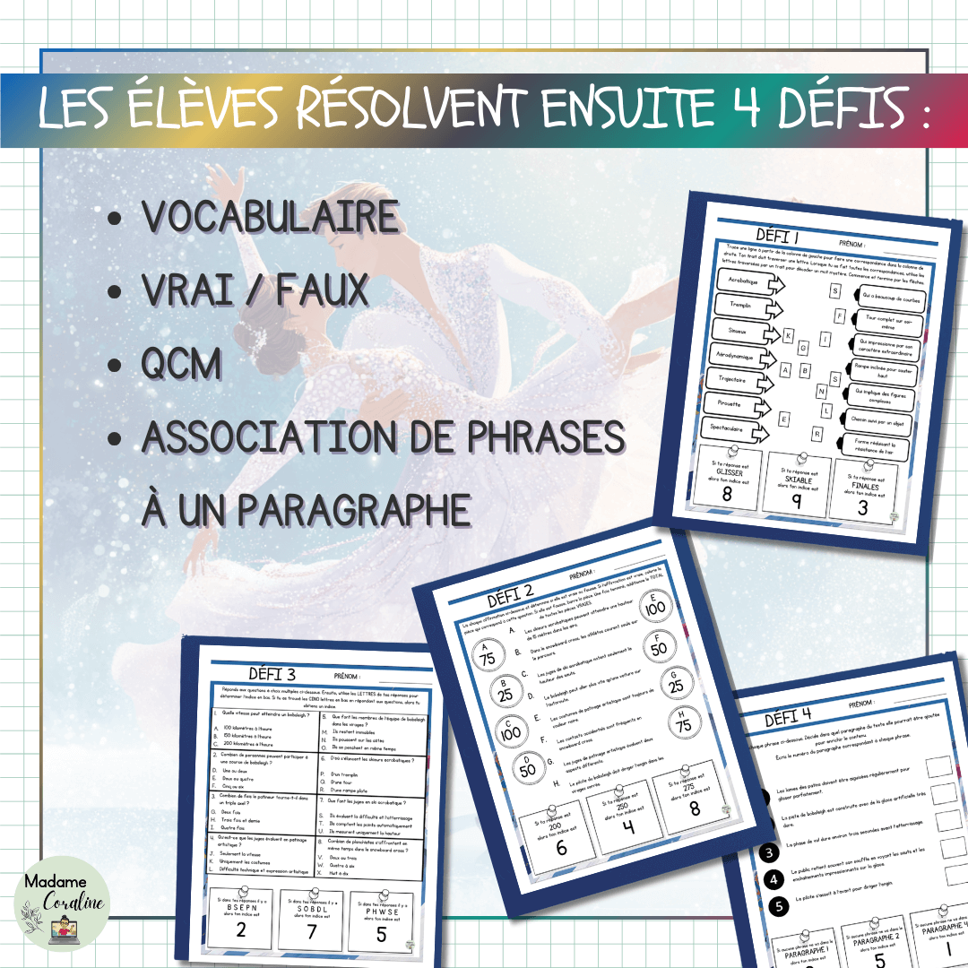 Fais vivre à tes élèves du 2e et du 3e cycle et de secondaire 1 une expérience de lecture immersive sur les sports les plus spectaculaires des Jeux Olympiques d'hiver ! À travers 4 défis stimulants --- correspondance, vrai ou faux, QCM et association --- ils développent leur compréhension, leur vocabulaire et leur esprit critique, tout en s'amusant.