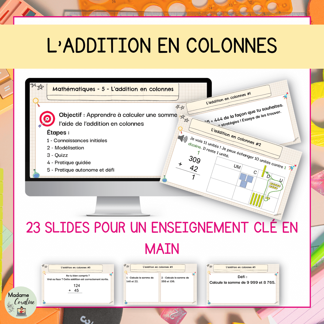 Une leçon complète pour enseigner l'addition en colonnes et son utilité, clé en main ! De la modélisation à la pratique autonome, tout est structuré et prêt à présenter aux élèves.