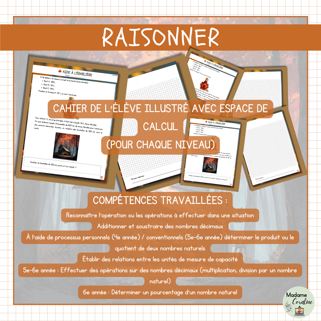 Tes élèves de 4e, 5e et 6e année aident une équipe à l'érablière ! Ils calculent la quantité d'eau d'érable récoltée, déterminent la production de sirop et planifient l'embouteillage dans différents formats de contenants. Un Raisonner ancré dans la tradition québécoise du temps des sucres --- concret, différencié et clé en main pour le 2e et le 3e cycle.