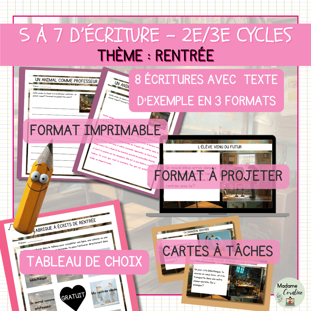 Encourage tes élèves à développer leur plume dès le début de l'année avec Ma fabrique à écrits de rentrée ! 8 activités créatives variées – narratif, descriptif, informatif, réflexif – autour du thème de la rentrée, avec textes d'exemple et tableau de choix motivant pour une autonomie garantie.