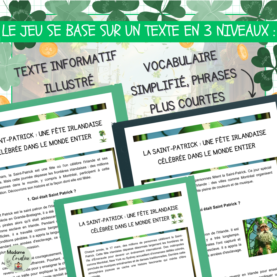 Jeu d’Évasion de Lecture Saint-Patrick | Texte Différencié 3 Niveaux | 2e-3e Cycle Primaire